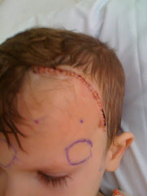 Today was a day full of waiting, high hopes, and some disappointment. It started with me waking up to a resident asking Eli if he wanted his head bandages off and him saying yes. I looked at the clock and it was 4:50am! I said, “Didn’t they say it had to stay on for 24 hours?” At this point she had already cut away half of it and she said, “No, the rule is the day after surgery.” The next thing I knew, I was staring at Eli’s new railroad tracks on his scalp. Dr. S did a great job of course and barely had to shave any hair. He made the cut go along Eli’s hairline and you can’t even see the port because it’s a very small lump under his hair! Here’s a picture I took for Eli so he could see what it looked like (he said, “That’s MY head?!?!”):